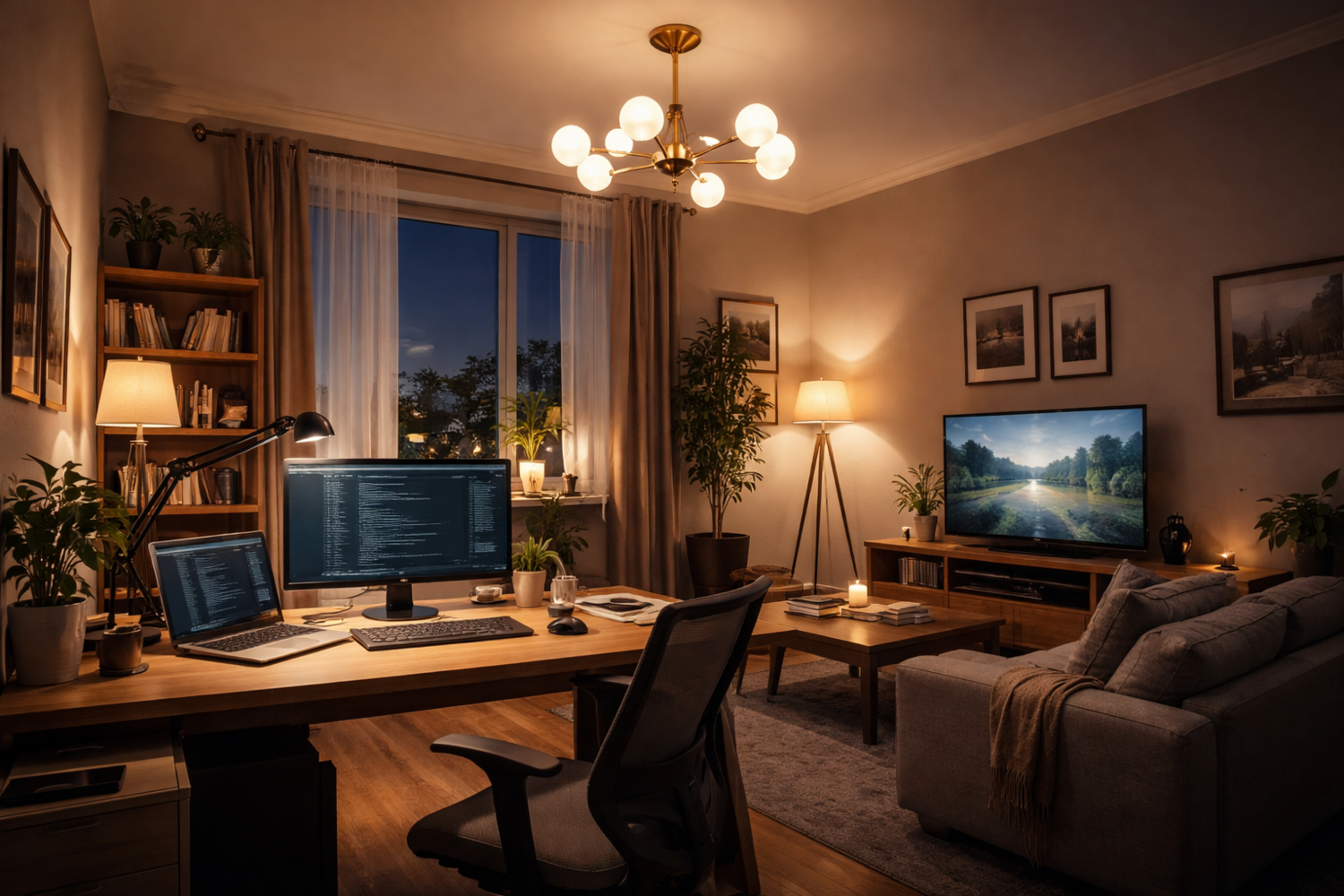 Стаття пояснює, чому правильне освітлення домашнього робочого місця є критично важливим для програмістів і фрілансерів, та чому загальне світло має поєднуватися з локальним.