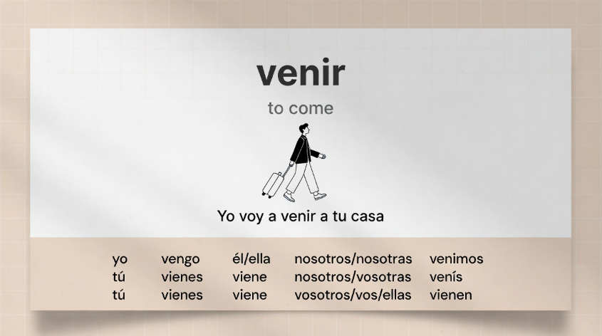 Venir належить до неправильних дієслів і поєднує в собі одразу кілька змін. У теперішньому часі відбувається чергування голосних e → ie, а форма першої особи однини має закінчення -go.